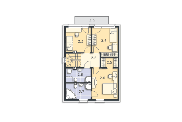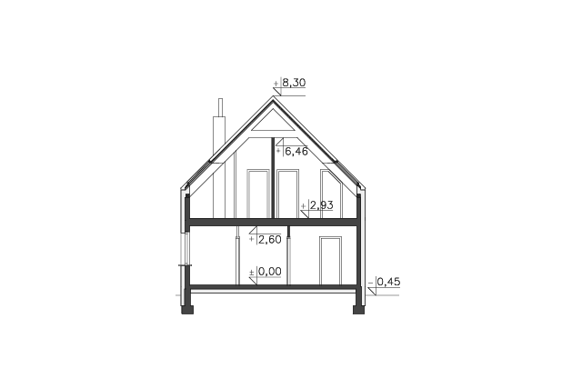 Na parterze oprócz kuchni, mieści się wc oraz pomieszczenie z kotłem c.o. Poddasze podzielono na dwie łazienki oraz trzy sypialnie. Dwie z nich mogą być przeznaczone na pokoje dziecinne, trzecia – z prywatną łazienką i garderobą – będzie wygodnym azylem dla rodziców. Dzięki zastosowaniu dużych przeszkleń, wszystkie pomieszczenia w budynku są doskonale doświetlone.