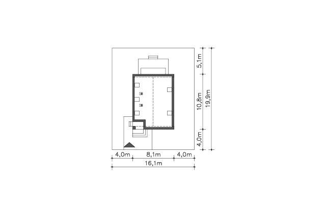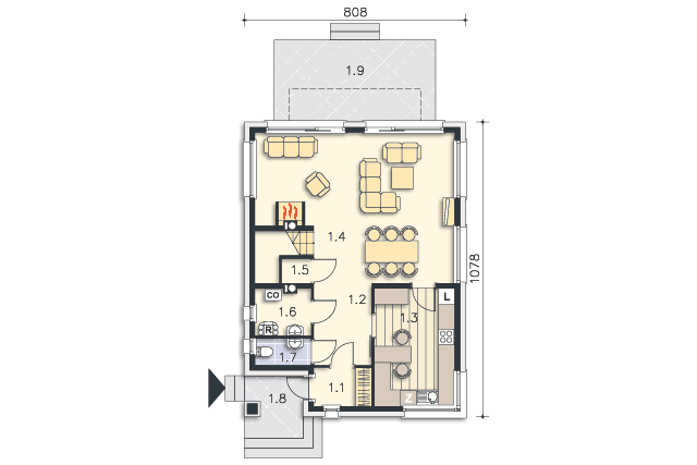 Wąski dom energooszczędny z użytkowym poddaszem, o prostej bryle, przykuwający uwagę nowoczesnym rozwiązaniem elewacji. Zadaszone wejście prowadzi do hallu, z którego można przejść do dużego, jasnego salonu z miejscem na stół jadalny i z kącikiem kominkowym.