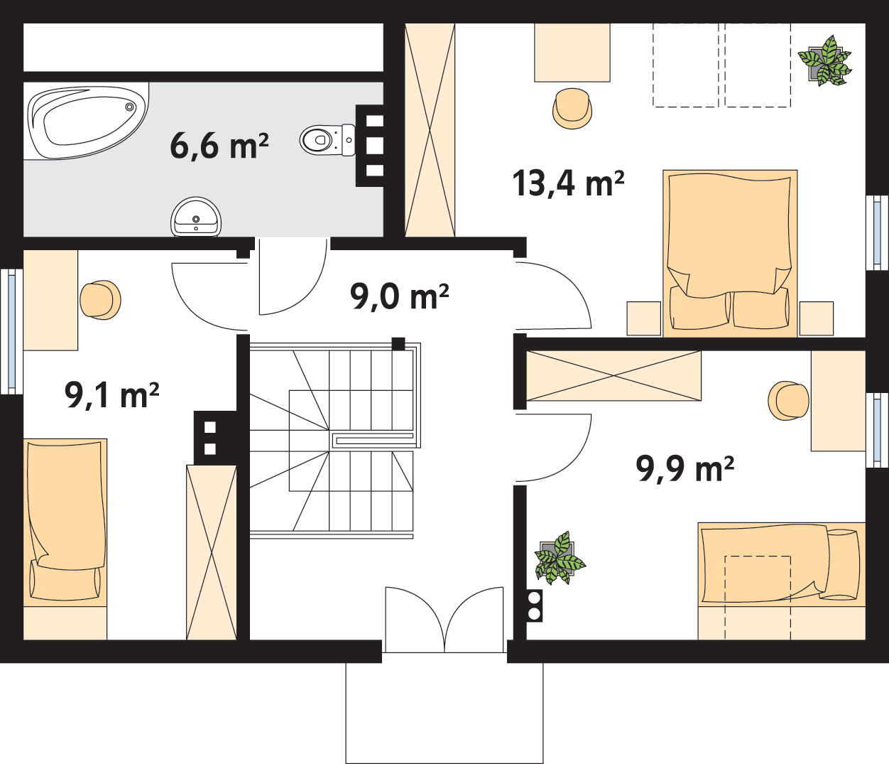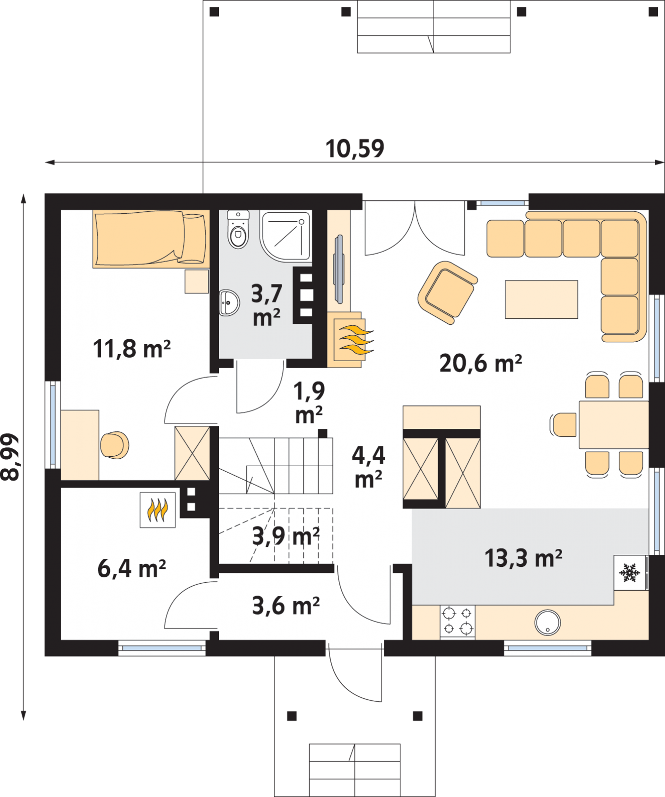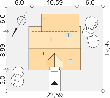 Jednorodzinny dom mieszkalny, parterowy z użytkowym poddaszem, niepodpiwniczony. Budynek zaprojektowano w technologii szkieletu drewnianego, wykończonego szalówką. Całość została ujęta w prostej, klasycznej bryle, przykrytej dwuspadowym dachem. Dom zawiera w sobie optymalny program dla 4-osobowej rodziny. Na parterze przewidziano dodatkowy pokój. Atutem projektu jest duży zadaszony taras.