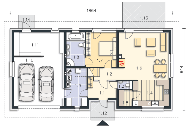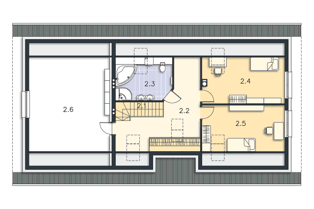 Piękny, prosty i funkcjonalny dom przeznaczony dla czteroosobowej rodziny. Sypialnia rodziców znajduje się na dole i posiada własną łazienkę, natomiast sypialnie dzieci zlokalizowane są na poddaszu. Na parterze mamy również przestronny salon połączony z kuchnią, spiżarnię i toaletę dla gości. Część gospodarczą stanowi dwustanowiskowy garaż, kotłownia i pralnia oraz strych nad garażem.
