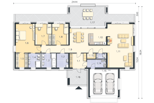 Mindelo to propozycja energooszczędnego domu parterowego, przeznaczonego dla większej rodziny, o prostej, ale eleganckiej bryle, z dwustanowiskowym garażem. Z myślą o wygodzie mieszkańców wyodrębniono dużą część dzienną, do której należy piękny salon z kominkiem i wygodną częścią wypoczynkową oraz funkcjonalnie rozplanowana kuchnia i jadalnia, z podniesionym sufitem.